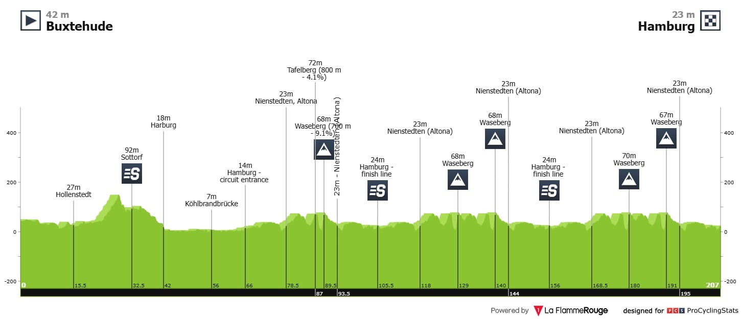 Final em circuito no acesso a hamburga, com o Waseberg como grande obstáculo: 700 metros a mais de 9%. A isto acrescem vários outros muros que tornam este um circuito bem catita.