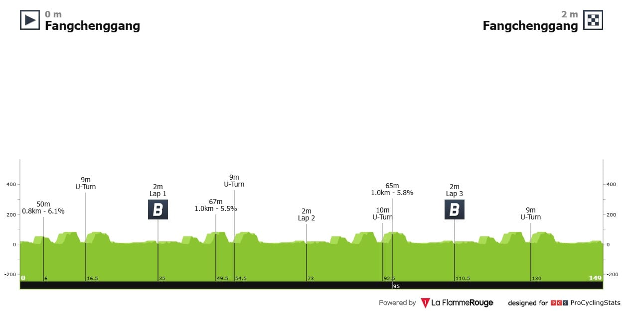 Etapa 1 — Circuito de quatro voltas na cidade portuária de Fangchenggang (é tipo Leixões), com umas lombas pequenas para causar desafio ao pelotão. Aqui o gangue vai chegar em grupo.