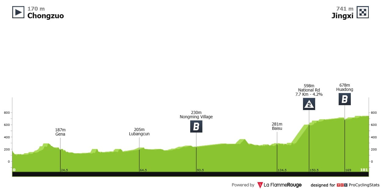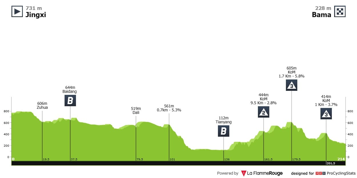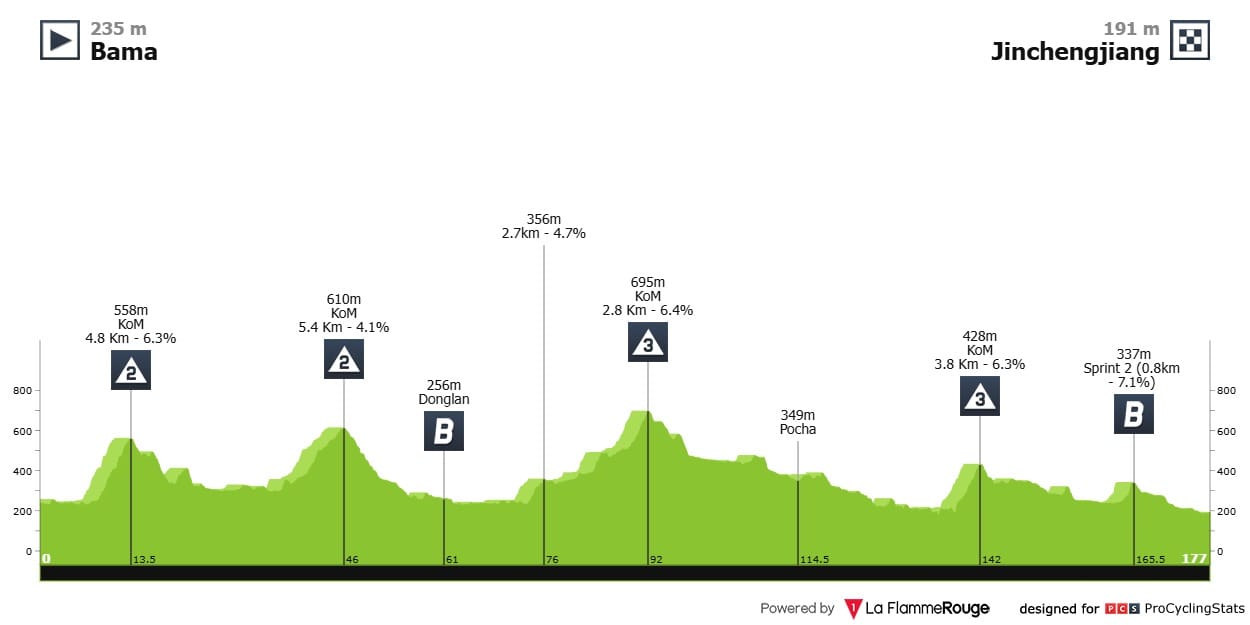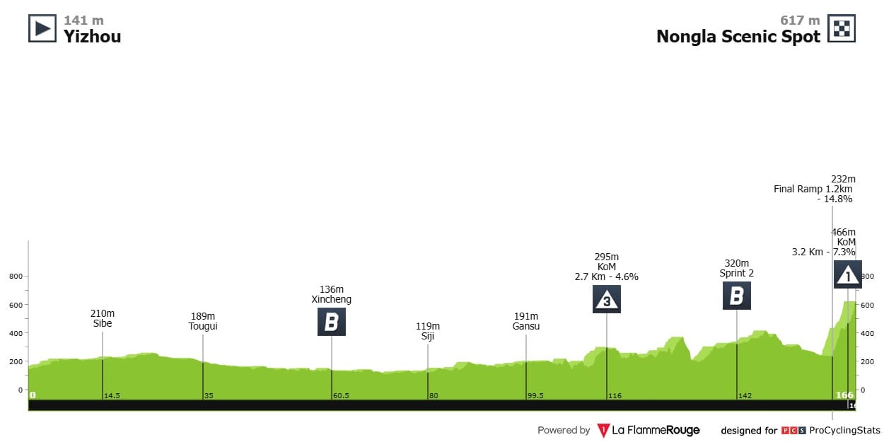 Etapa 5 — A etapa que seguramente decidirá o vencedor da Geral. Os puncheurs e montanhistas vão lutar para chegar primeiro ao topo do Nongla Scenic Spot; começa com uma rampa de respeito – 1.2km a 14.8% (!) de média – e mais 3 km a perto de 7%. Vai doer.