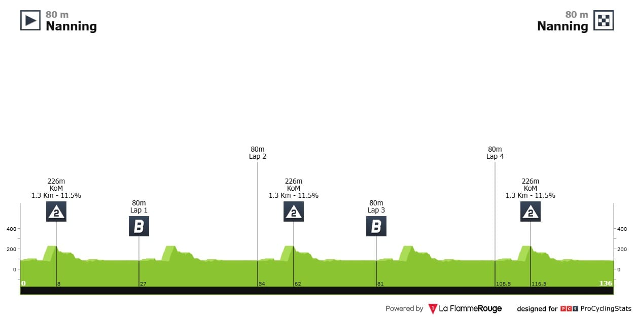 Etapa 6 — Mais um circuito, desta vez em Nanning, para fechar como começámos: com um sprint compacto. Destaque para a segunda categoria (1.3km a 11.5%), só para dar uns vincos nesta tábua de engomar.
