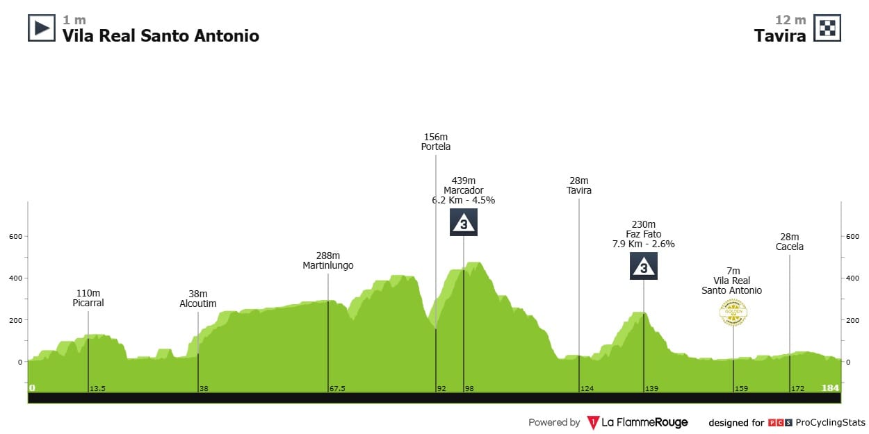 Etapa 1 — A Algarvia arranca pela terceira vez de Vila Real de Santo António. Mas a principal novidade está na chegada a Tavira que se espera em sprint compacto. A introdução do "quilómetro de ouro", uma sequência de três sprints bonificados colocados num troço de empedrado da cidade.