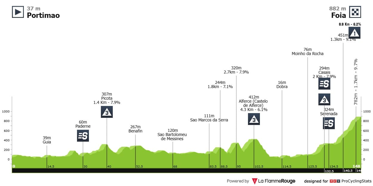 Etapa 2 — A primeira chegada em alto. E outra novidade. Cenário igual, mas a ascensão final à Foia será feita por outro lado, por sinal mais duro, com pendentes a chegarem aos 14%.