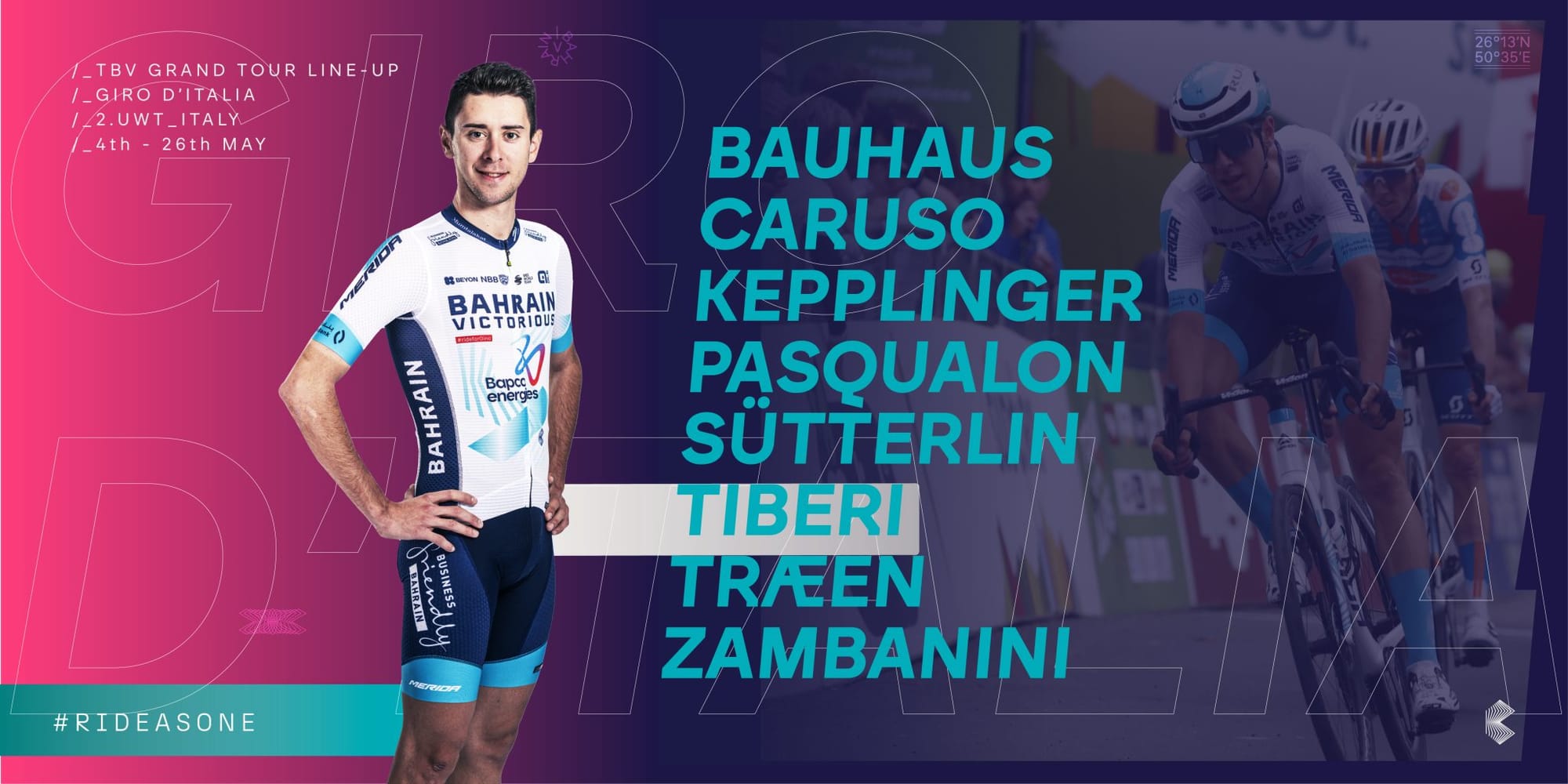 Aos 22 anos, Antonio Tiberi chega ao Giro no melhor momento da sua carreira. O talento italiano deu excelentes indicações na Vuelta 2023 e as boas pernas seguiram para a nova época. A Bahrain, sem medo, assume Tiberi como líder, ainda que tenha no seu oito Damiano Caruso. Caruso sabe o que é brilhar no Giro (foi segundo em 2021 e quarto em 2023), mas aos 36 anos o capitão da Bahrain parece lidar bem com a passagem de testemunho — além disso, colocar-se ao serviço de Tiberi não quer dizer que não vença uma etapa ou não feche top-10.