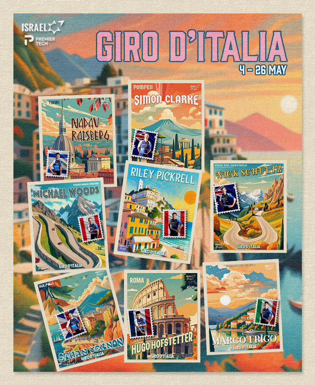 Nick Schultz, Simon Clarke e Marco Frigo são outros dois nomes para tentarem sacar mais uma vitória em etapa para a Israel em terrenos mais exigentes. Ethan Vernon e Hofstetter ficarão com os sprints, mas com tanta truta presente não devem ter grande hipótese.
