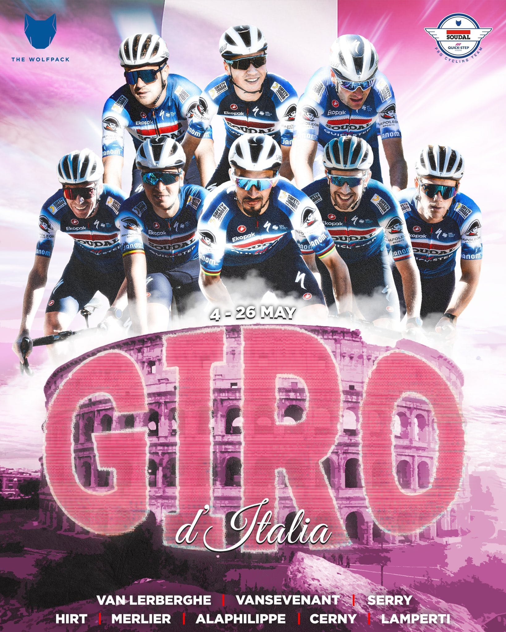 A Soudal Quick-Step é agora uma equipa de grandes voltas. Não é? Eu acho que é, ou pelo menos convém que seja equipa de alguma coisa. Bom, a GC é para esquecer. Mas Jan Hirt e Mauri Vansevenant podem bem esgrimir argumentos por vitórias em etapas. E depois é contar com Merlier, o sprinter mais em forma presente nesta startlist — Lamperti, Van Lerberghe, Serry e Černý (este último com a possibilidade de fechar top-5 nos dois contrarrelógios).