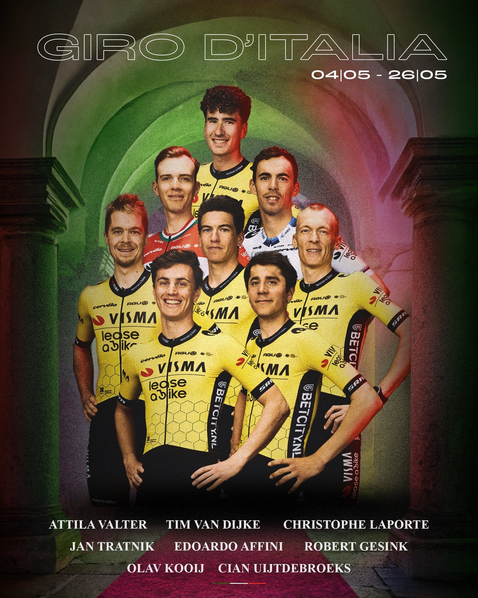A outra estrela da companhia é naturalmente Olav Kooij. Em estreia em grandes voltas, o sprinter quererá começar por sacar uma vitória e depois, com as pernas mais leves e uma pressão menor, partir para mais alguma. É um dos homens mais rápidos aqui presentes e será, a meu ver, o responsável pelas maiores alegrias da Visma nestas três semanas. Terá Tim Van Dijke, Laporte, Affini e Tratnik no seu comboio, o que convém dizer, é bem bom. Além disso, há Attila Valter e Robert Gesink para terrenos mais exigentes. Uma coisa é certa: esta formação da Visma é multifacetada, cobre vários cenários e tem gente de muito talento para caçar etapas: pensemos em Kooij, Laporte, Tratnik e Valter.