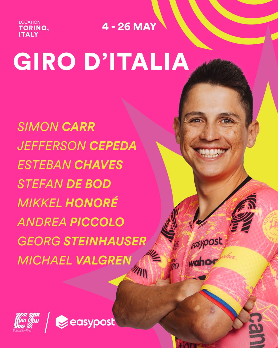 Na equipa da EF para o Giro há ainda Jefferson Alexander Cepeda, Simon Carr, Michael Valgren, Andrea Piccolo, Stefan De Bod, Mikkel Honoré e Georg Steinhauser. Conclusão? É óbvia. A formação norte-americana está no Giro à procura de etapas. Talvez Cepeda e Carr tenham a camisola da montanha em vista, quem sabe. Andrea Piccolo faz a sua estreia no Giro e deverá ser um corredor ofensivo, ainda que a forma até aqui deixe a desejar.