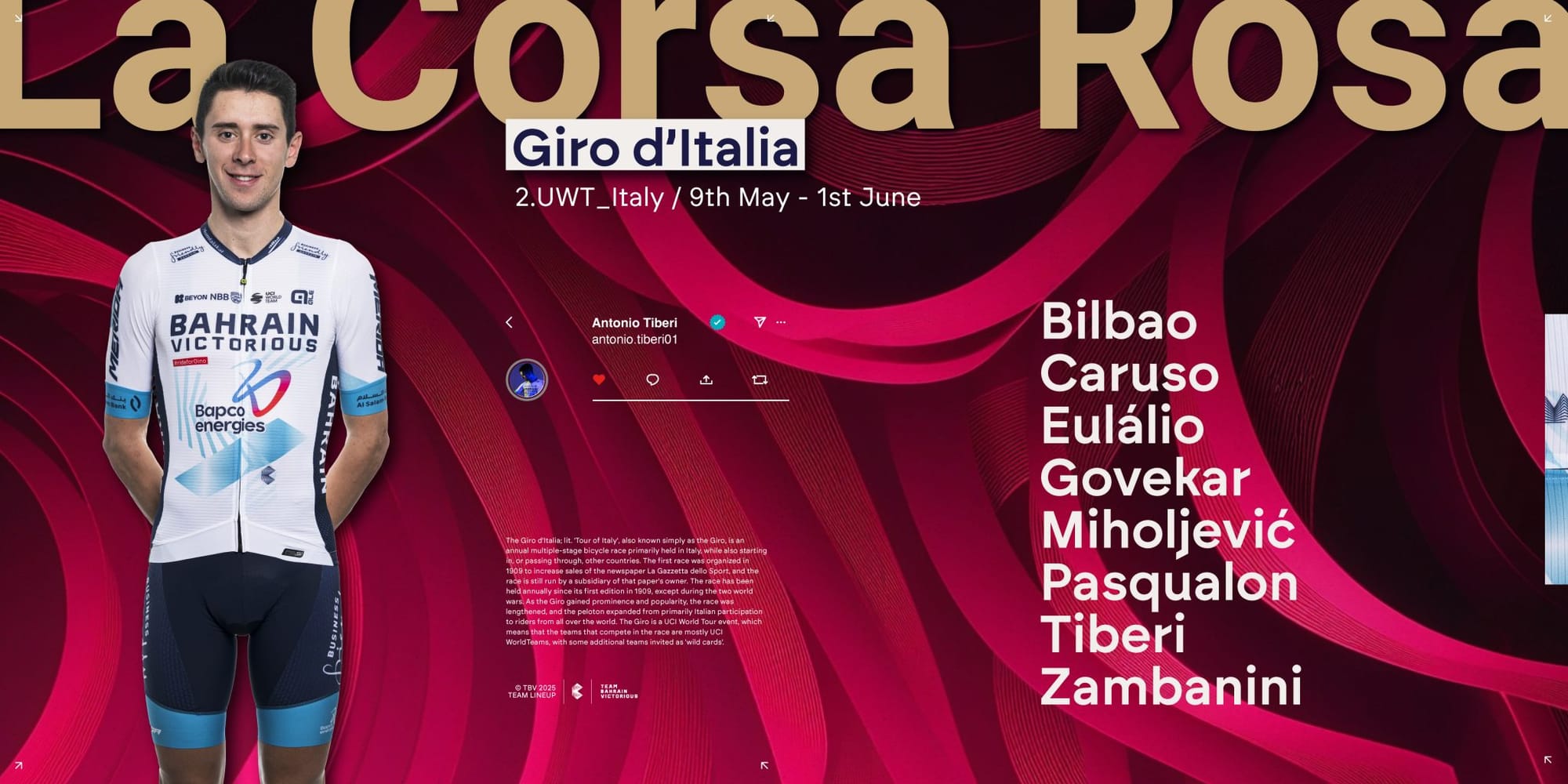 A estrutura da Bahrain tem tido bastante sucesso nesta Grande Volta, com quatro pódios — Nibali em 2017 e 2019, Caruso em 2021 e Landa em 2022 — e uma maglia ciclamino com Jonathan Milan em 2023, além de oito triunfos nas últimas oito edições. Na última levaram a camisola da juventude com o sniper Antonio Tiberi, que se apresenta este ano com aspirações ao pódio final. É esse o objetivo claro da equipa, que leva um bloco muito equilibrado, capaz de proteger o Yusuf Dikeç transalpino em todos os terrenos.