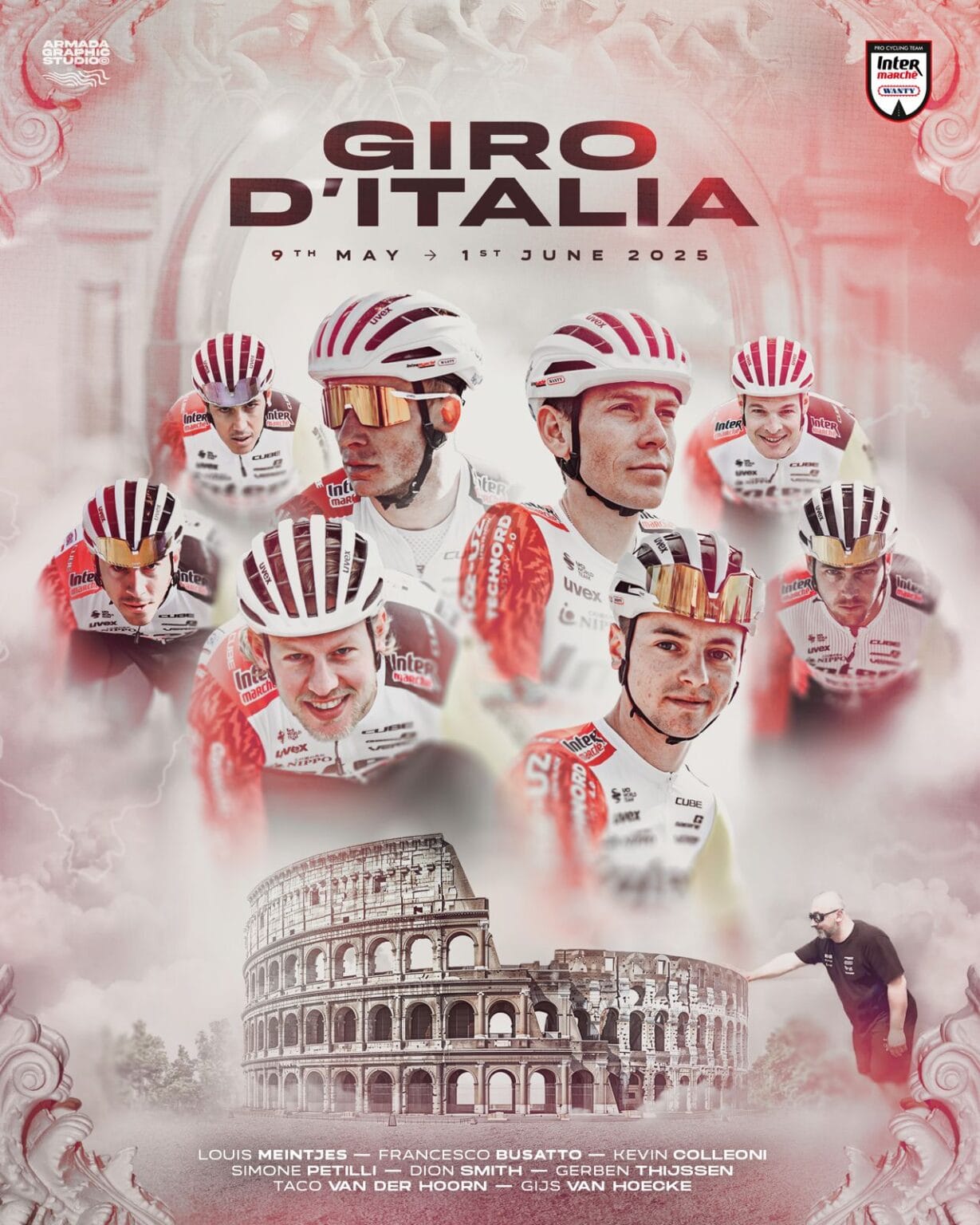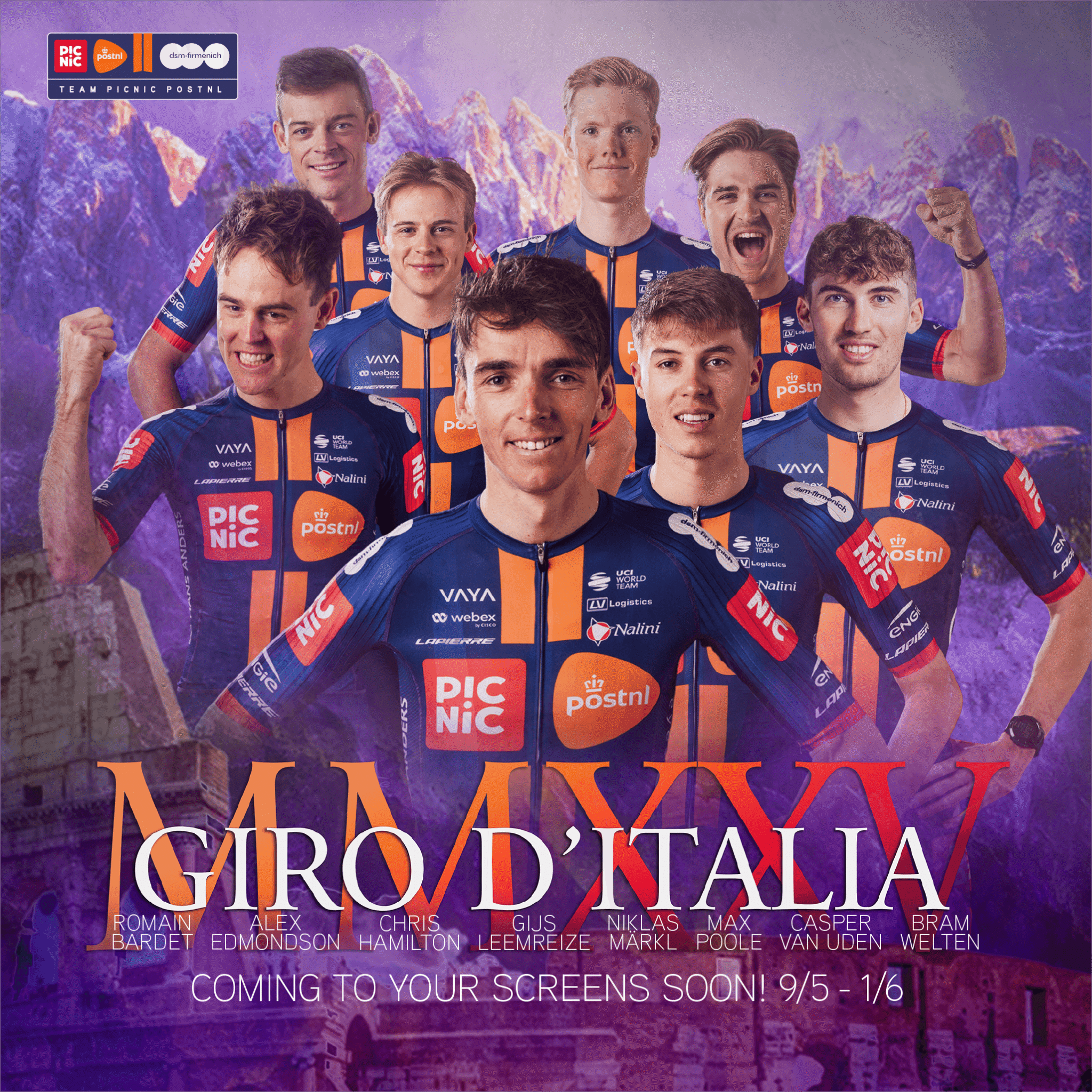Chris Hamilton e Gijs Leemreize serão os gregários nas montanhas transalpinas, enquanto que Alex Edmondson, Niklas Märkl e Bram Welten são os roladores do comboio de Casper van Uden, o sprinter da equipa.