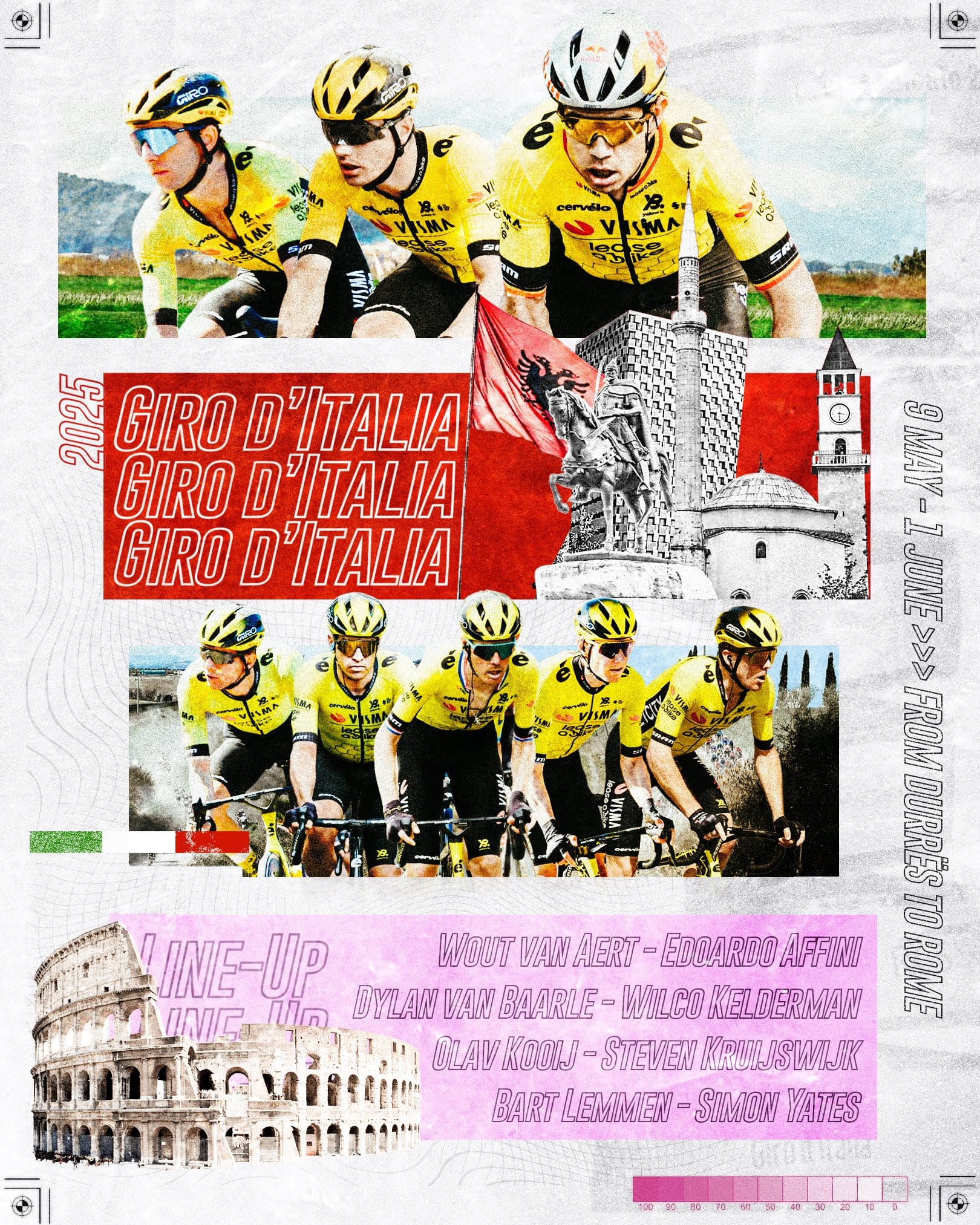 Uma equipa equilibrada que desta vez vai sem ambições para a GC. Para os sprints contam com Olav Kooij, que venceu na última edição em Nápoles e vai querer repetir a proeza, mas agora sem abandonar no primeiro dia de descanso. Lançado por Wout van Aert, é o favorito em todas as etapas planas. O belga faz finalmente a sua estreia no Giro e vai ser destaque nos contrarrelógios e nas etapas punchy.