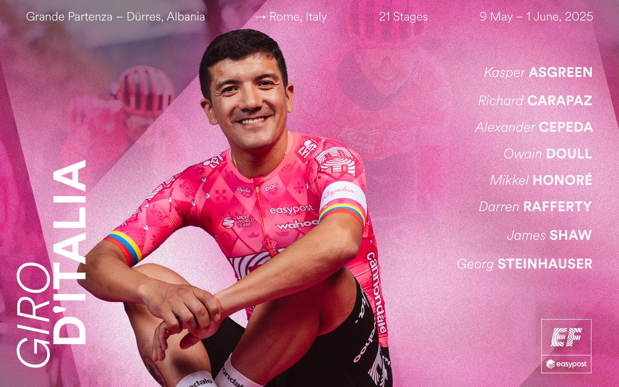 Uma das maiores incógnitas desta edição está aqui: que Richard Carapaz vamos ver? Vai voltar a disputar a maglia rosa? Ou vai andar à maluca à caça de etapas e quiça da maglia azzurra? Uma coisa é certa, vai dar espetáculo. Georg Steinhauser é outro nome entusiasmante desta EF. Deu show na última edição com a vitória no Passo Brocon e fez mais dois top-3, tudo isto entre a etapas 15 e 19.