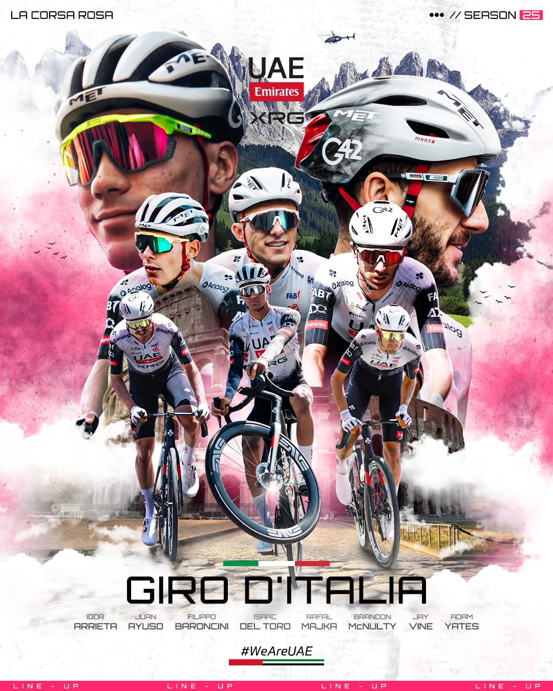 Isto abriu com uma das equipas desilusão de 2025 e acaba com a equipa sensação. A Astana está a fazer uma temporada incrível, com uma recuperação extraordinária no ranking UCI. Lorenzo Fortunato vem de um 4.º lugar na Volta à Romandia, conquistada pelo nosso João Almeida, e está aqui com ambições de fazer uma boa classificação geral ou, quem sabe, conquistar uma grande vitória como no Monte Zoncolan em 2021. O veterano Wout Poels, recém-vencedor da Volta à Turquia, e os italianos Nicola Conci e Fausto Masnada, são trepadores muito competentes.
