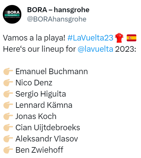 A BORA apresenta um bloco com fortes aspirações à geral, legítimas, na minha opinião. Aleksandr Vlasov aparece numa forma muito boa — 3.º em San Sebastián e 2º em Burgos — e conta com nomes muito competentes para a alta montanha.