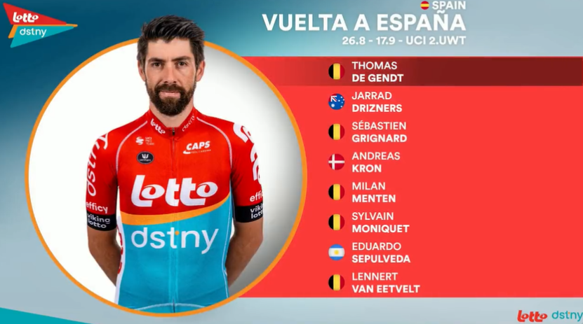 A Lotto tem como objetivo a conquista de etapas e para tal conta com alguns corredores com pergaminhos para tal. O experiente Thomas De Gendt ainda não venceu este ano e vai fazer a primeira grande volta da temporada. Já triunfou por oito vezes em Espanha, incluindo uma etapa na Vuelta em 2017, um ano antes de levar para casa a camisola da montanha.