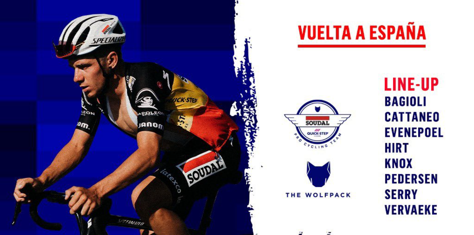 A Soudal - Quick Step tem um objetivo muito simples para esta edição da Vuelta: revalidar o título de Remco Evenepoel. O belga encontra-se em estágio em altitude, vamos ver como se aguenta no Tourmalet e no Angliru. O suporte não é tão forte como a Jumbo, UAE e INEOS. Louis Vervaeke e Pieter Serry são corredores da confiança de Remco e contribuiram para o sucesso na última Vuelta. Também fizeram parte do bloco que foi ao Giro.