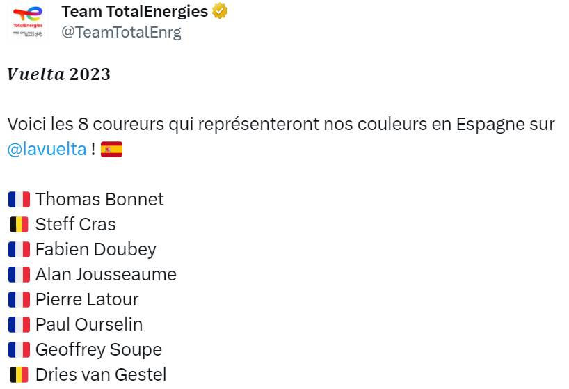 Bem, vendo bem as coisas se calhar a AG2R não é a pior equipa do WT aqui presente. Há outra equipa francesa que consegue baixar ainda mais as expectativas. Falo da TotalEnergies, claro. E é que nem uma foto decente da seleção meteram...