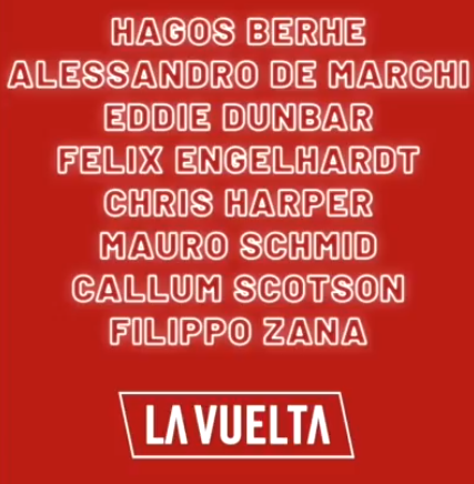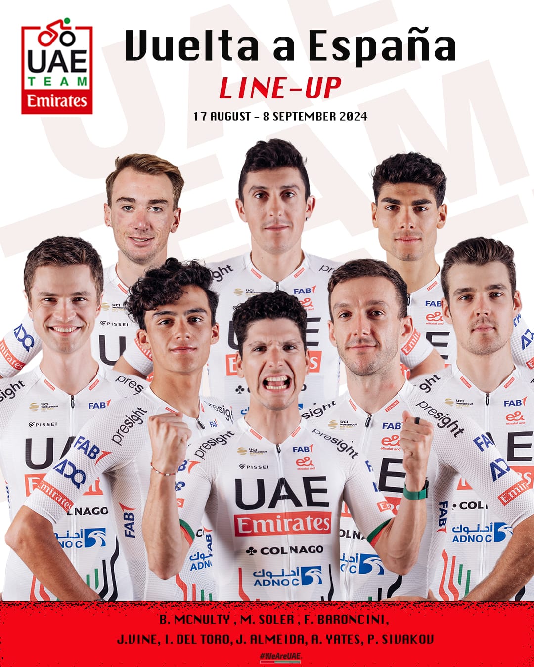 Jay Vine não corria desde o grave acidente no País Basco, mas a vitória no contrarrelógio da Vuelta a Burgos, logo após o seu regresso, fez com que a equipa lhe desse a última vaga. Pavel Sivakov não se portou mal no Tour e andou bem em San Sebastián. Filippo Baroncini faz a sua estreia em grandes voltas.