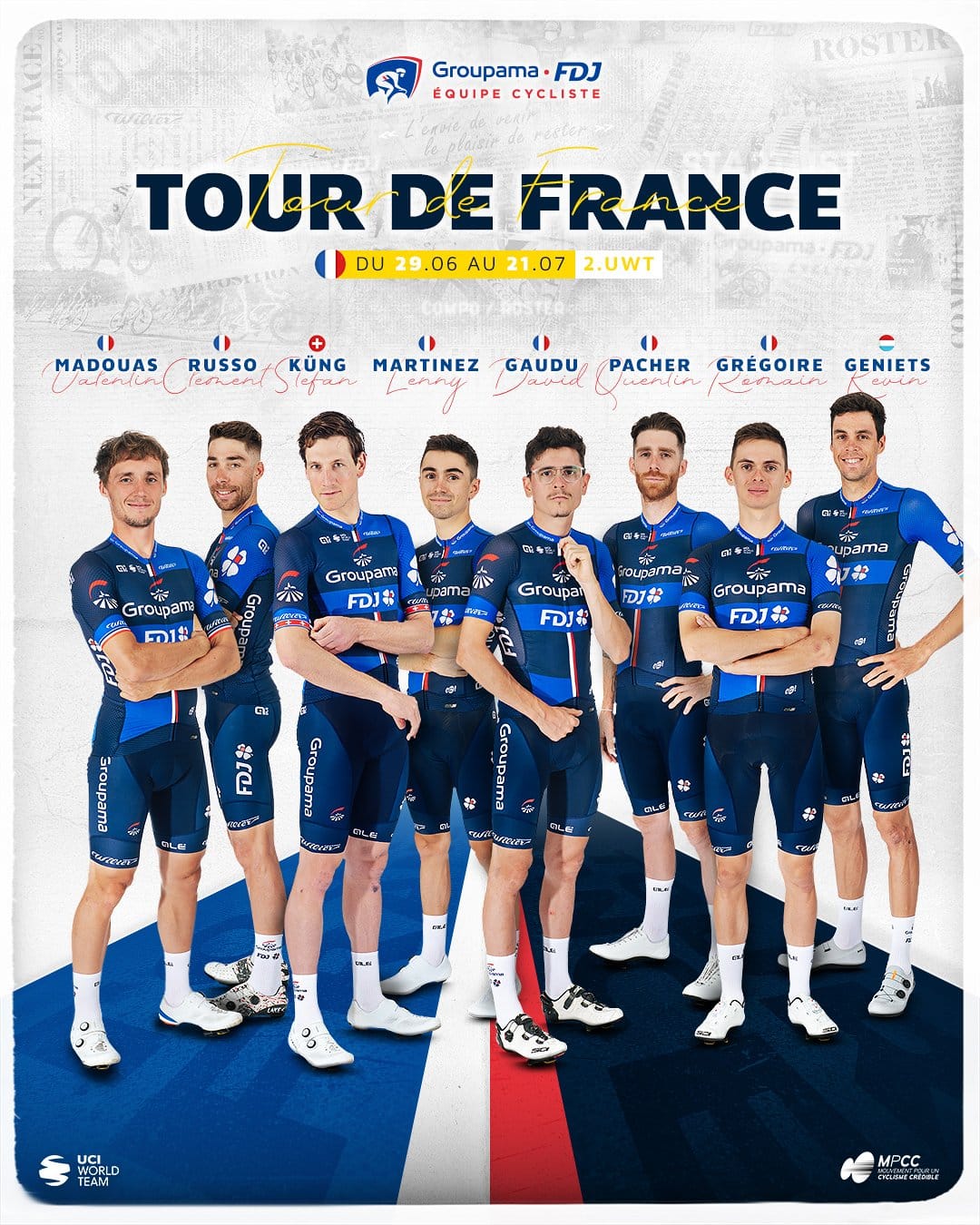 Romain Grégoire é outro jovem promissor francês que terá várias etapas ao seu jeito e, quem sabe, pode disputar a maillot jaune nas primeiras etapas. Stefan Küng & Valentin Madouas entendem-se bem e podem dar espetáculo nas etapas ao estilo das clássicas. Quentin Pacher, Kevin Geniets (campeão luxemburguês) e Clément Russo perfazem o 8 da Groupama.