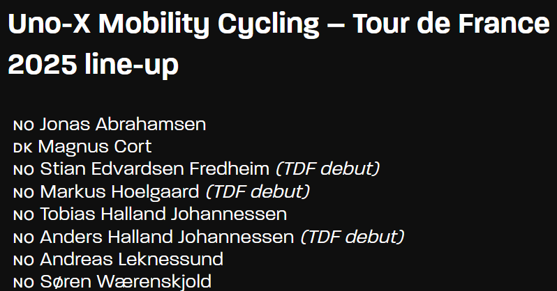 A melhor lineup de sempre da Uno-X? Sinto que falta o Kristoff mas sim, belo 8. A equipa nórdica quer muito a primeira etapa no Tour e eu acho que vão conseguir. Com quem? É uma lotaria. Se eu tivesse de meter as fichas ia no Tobias Halland Johannessen — foi 5.º no Dauphiné. Quem também está a andar muito é o irmão Anders Halland Johannessen — conquistou a Volta à Eslovénia.