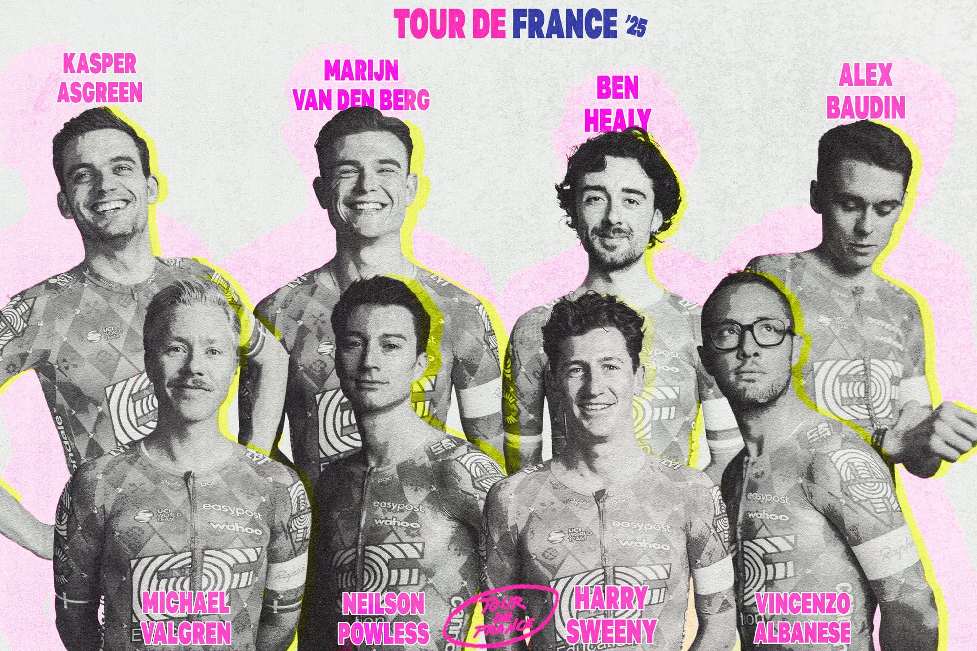 Sem Carapaz o objetivo é claro: caçar etapas. Vá lá, com o equatoriano ia ser a mesma coisa mas com mais hype. A EF, apesar de não ter conseguido a maglia rosa, venceu duas etapas, uma delas com Kasper Asgreen que vem aqui tentar vencer uma etapa pela segunda vez. Isto no fundo são 21 corridas de um dia seguidas, e como ele gosta de clássicas... É ele e o Neilson Powless, que já deu baile à Visma este ano e costuma andar bem no Tour: cheirou a amarela em 2022 e passeou a camisola da montanha em 2023.