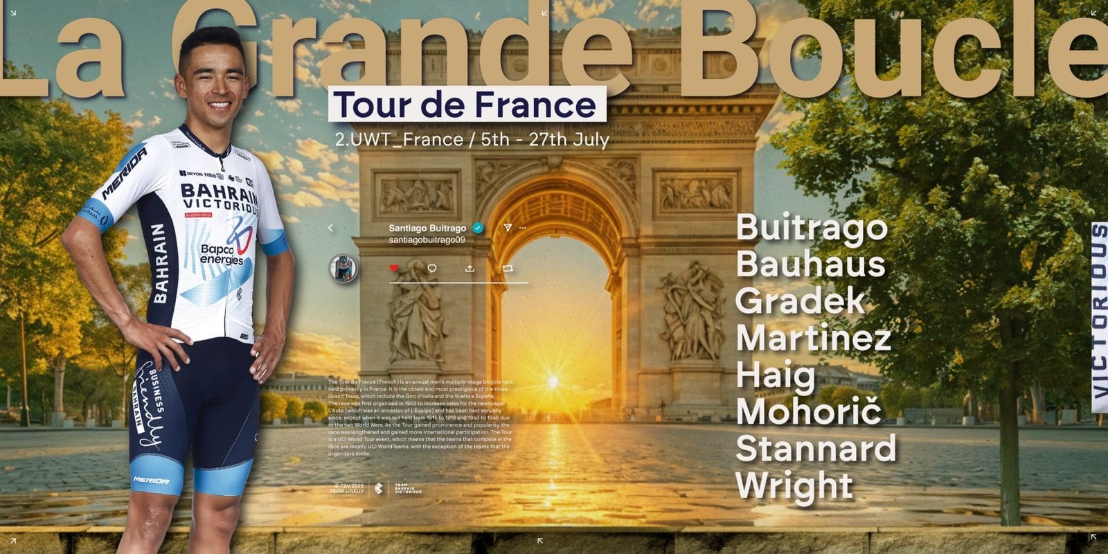 Santiago Buitrago lidera a Bahrain com aspirações à geral. Arrancou bem a temporada mas tem vindo a perder gás, veremos se consegue repetir ou melhorar o 10.º lugar da última edição. Nas montanhas há Jack Haig, um gregário competente na terceira semana, e o miúdo Lenny Martinez, que, sem responsabilidades para a geral, vai ter liberdade para tentar ganhar uma etapa e quem sabe tentar disputar a camisola da montanha.