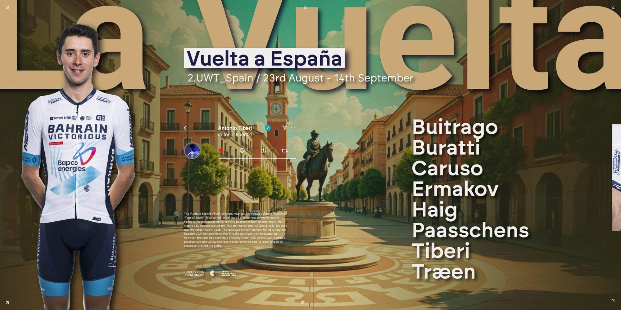 A Bahrain aponta ao pódio com Antonio Tiberi. Realista? Não é irrealista. Tem muita qualidade e consistência, e o contrarrelógio beneficia-o perante grande parte da concorrência. O 2.º lugar na Polónia confirma a boa forma. A segunda etapa, em Limone Piemonte, assenta bem ao italiano.