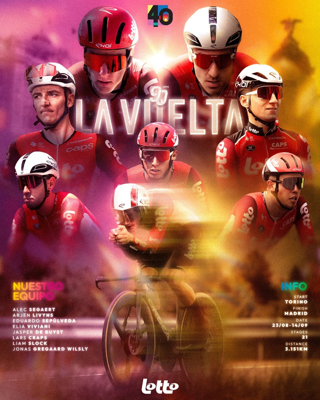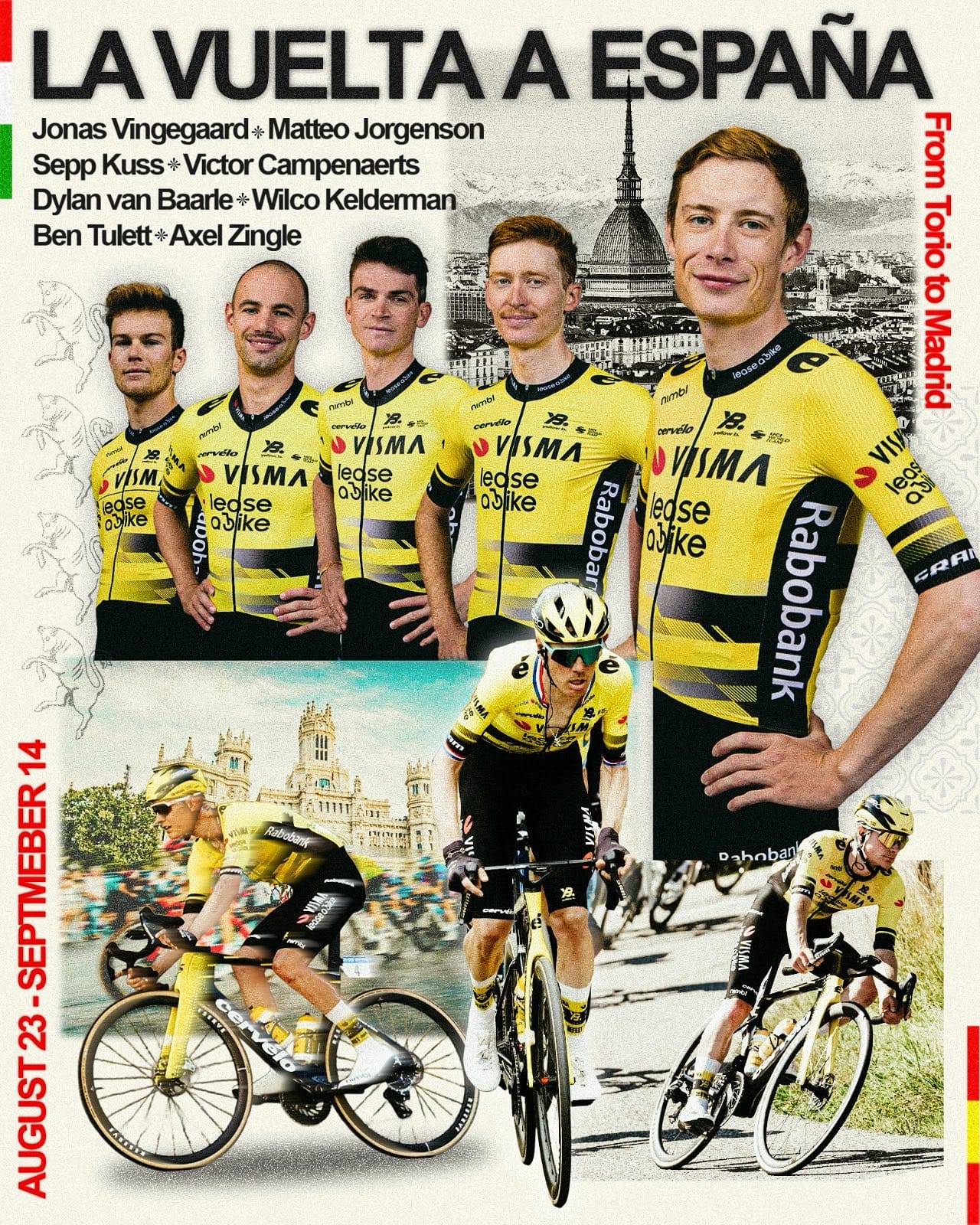O enxame da Visma vai mesmo com tudo para conquistar a roja, não abdicaram dos melhores operários no plano para guiar a sua rainha fora da colmeia: Victor Campenaerts (que Tour!), Dylan van Baarle (de saída para a Quick-Step) e Axel Zingle (Laporte 2.0). Os zangões Wilco Kelderman e Ben Tulett estiveram bem no Tour de l'Ain e vão ser os primeiros a meter o ritmo alto na montanha.