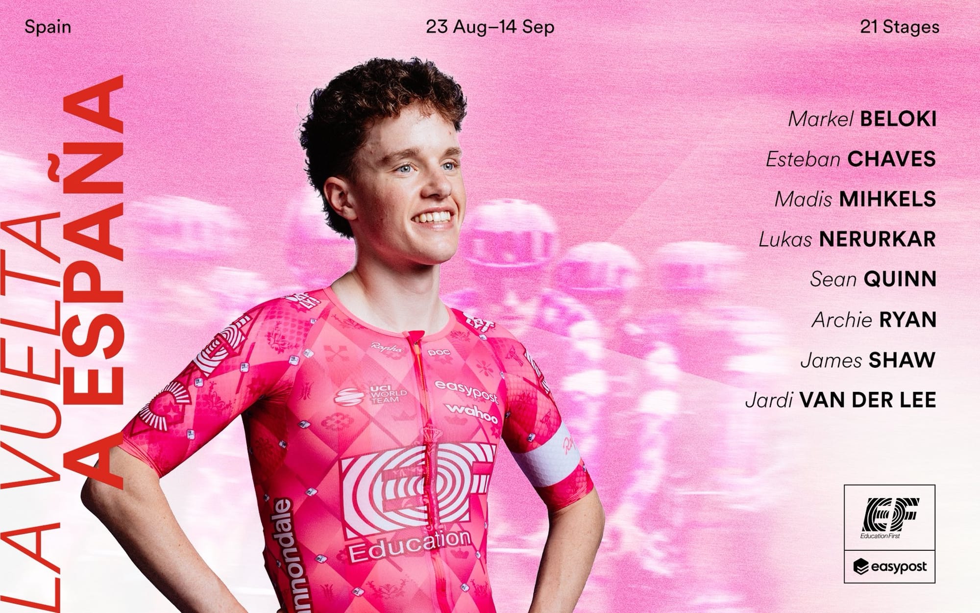 Carapaz viu o bloco da EF e anunciou a sua ausência da Vuelta. Eu fazia exatamente o mesmo. É talvez o bloco mais fraco de uma equipa World Tour aqui. Sem objetivos para a classificação geral, contam com a irreverência dos estreantes Markel Beloki, Lukas Nerurkar, Archie Ryan e Jardi Christiaan van der Lee. Destes quatro diria que Nerurkar e Ryan podem obter resultados interessantes.