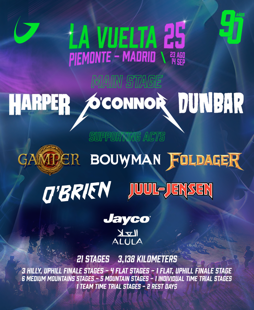A Jayco anunciou um cartaz interessante para esta Vuelta. No palco principal o destaque é Ben O'Connor, 2.º classificado na última edição, conhecido pelo seu estilo heavy metal — especialmente heavy quando as pendentes ficam muito inclinadas. O alinhamento conta ainda com Eddie Dunbar, corredor de rock psicadélico — piscas os olhos nos últimos quilómetros e lá vai ele — e Chris Harper, com o seu pedalar grunge.
