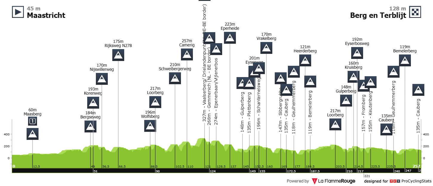 A fase decisiva será perto dos 50 quilómetros para a meta. Gulperberg (1 km a 4,7%), Kruisberg (500 m a 9.4%), Eyserbosweg (600m a 9.2%), Fromberg (800 m a 4.1%) e Keutenberg (1.2 km @ 6.2%) constituem a tradicional sequência de bergs fulcral para a decisão da corrida.