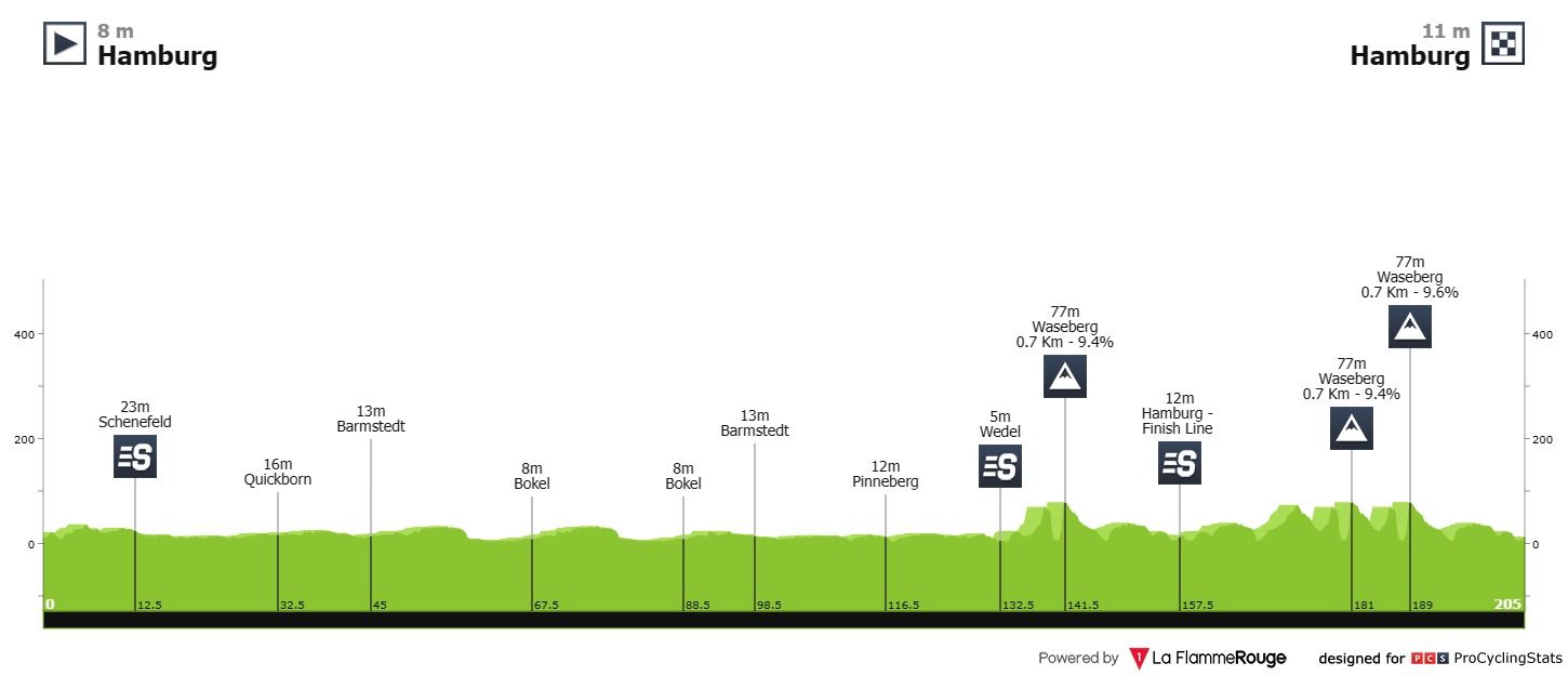 Nos 205 quilómetros podemos contar com uma boa parte do traçado em plano. Os ciclistas irão sair da cidade de Hamburgo e andar um pouco pelos seus subúrbios.