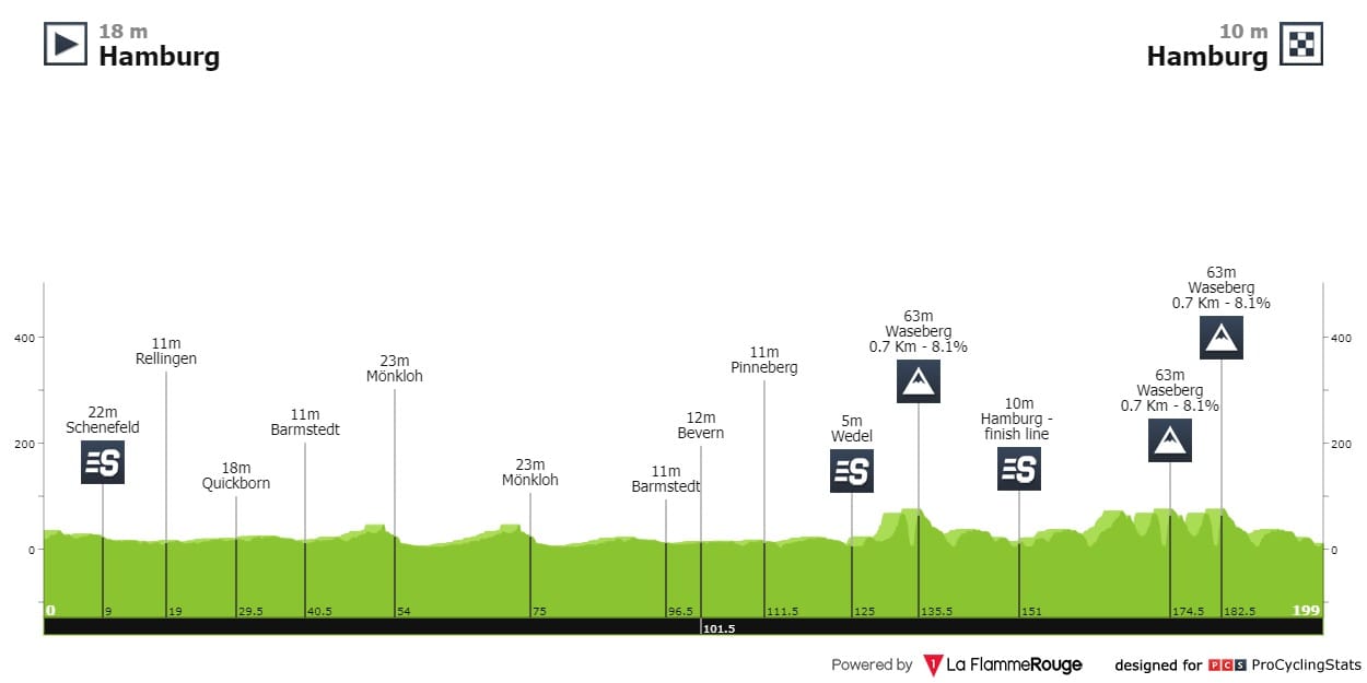 Com partida e chegada em Hamburgo é uma prova de perfil maioritariamente plano, com exceção das três passagens pelo Waseberg (0.7km a 8.1%), a última delas já dentro dos 20 quilómetros finais. A chegada é rápida e geralmente tende a ser caótica.