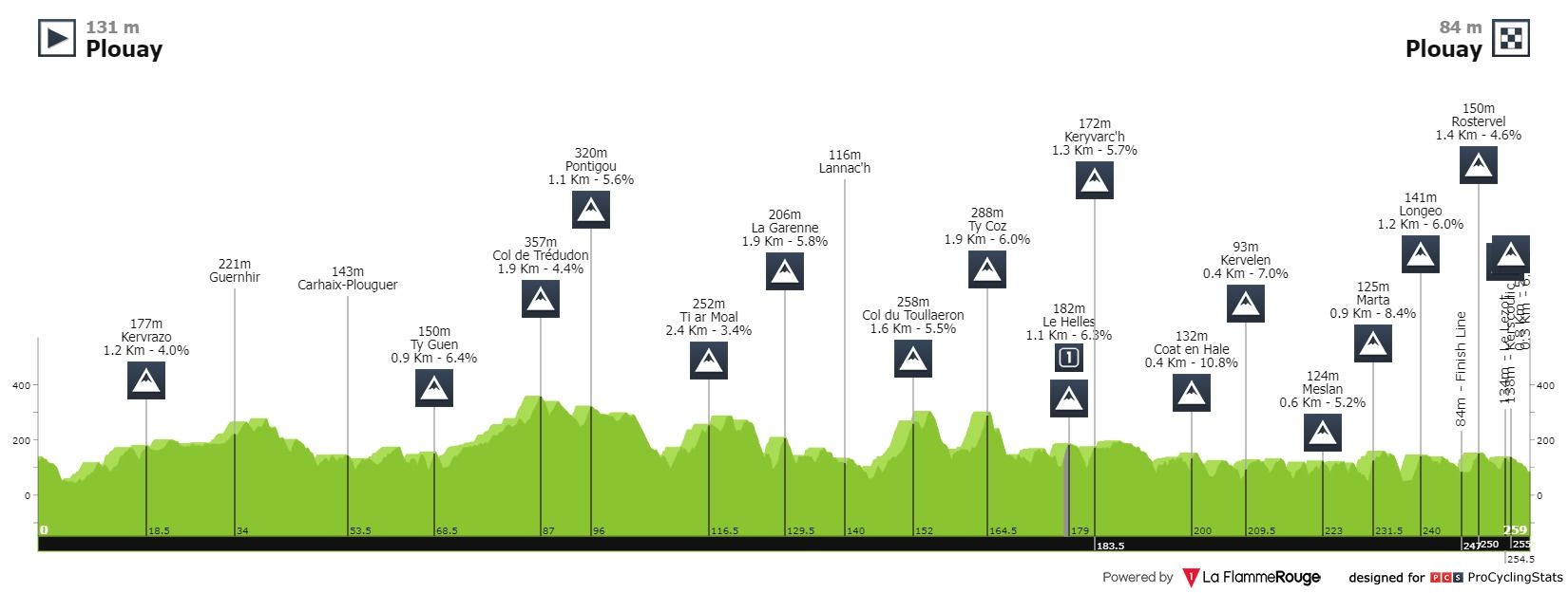 A primeira metade do percurso conta com 6 topos, enquanto que a segunda com 12, totalizando assim um total de 18, em torno de Plouay. Será uma ondulação constante do início ao fim e creio que as maiores dificuldades serão já na segunda metade onde destaco Ty Coz (1.9km - 6.0%) já dentro dos 100 quilómetros finais e depois já dentro dos últimos 30 quilómetros, a chegada a Marta (0.9km - 8.4%) seguida de Longeo (1.2km - 6.0%), onde os corredores ficarão já a menos de 20 quilómetros da meta.