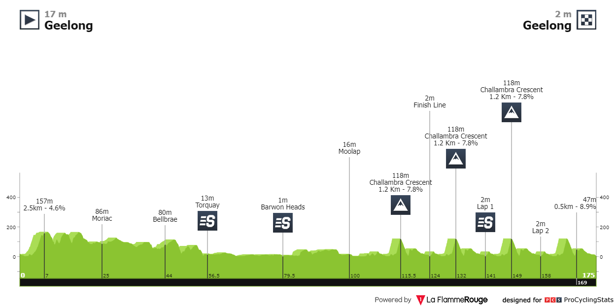 Entrando novamente em Geelong (risos), irá começar certamente o posicionamento das equipas na luta pela vitória. Os 75 quilómetros finais contam com 4 voltas ao percurso que terá como maior dificuldade a notável subida a Challambra (1.5km - 7,9%).
