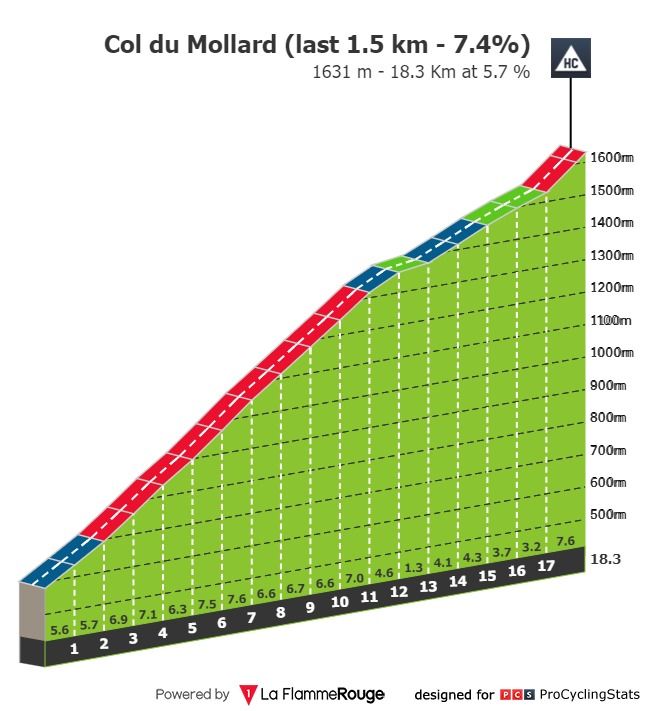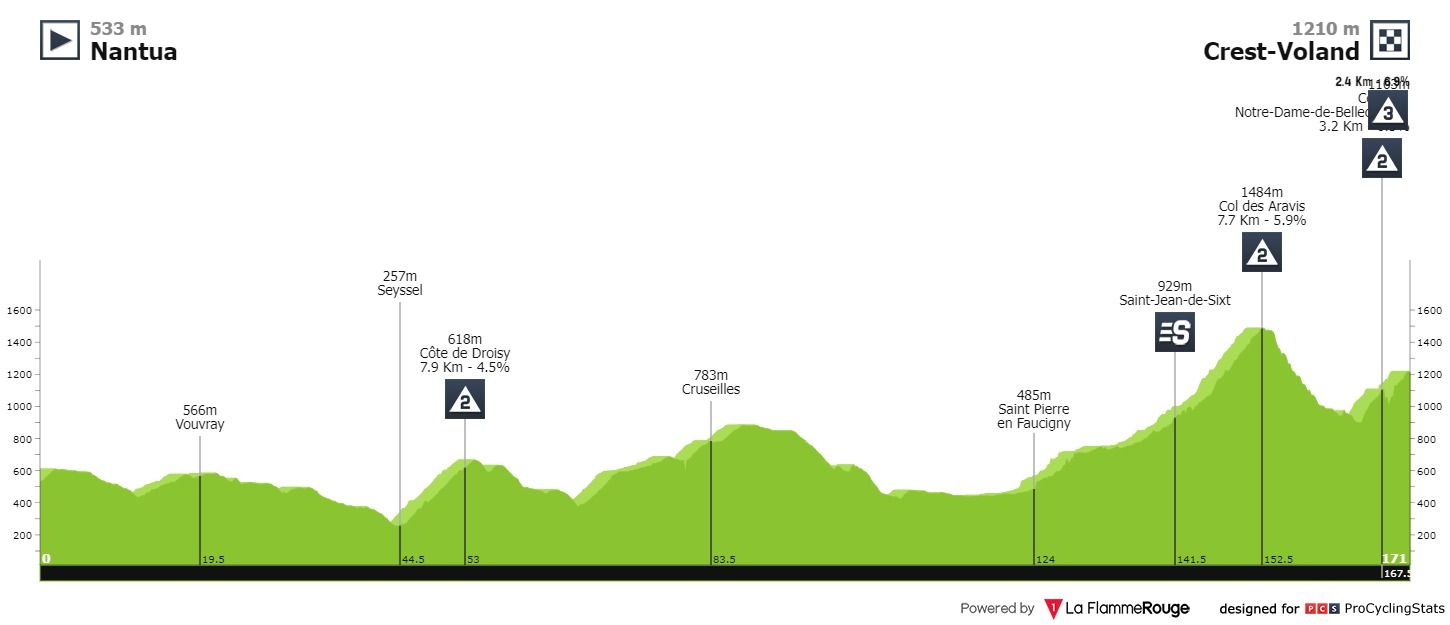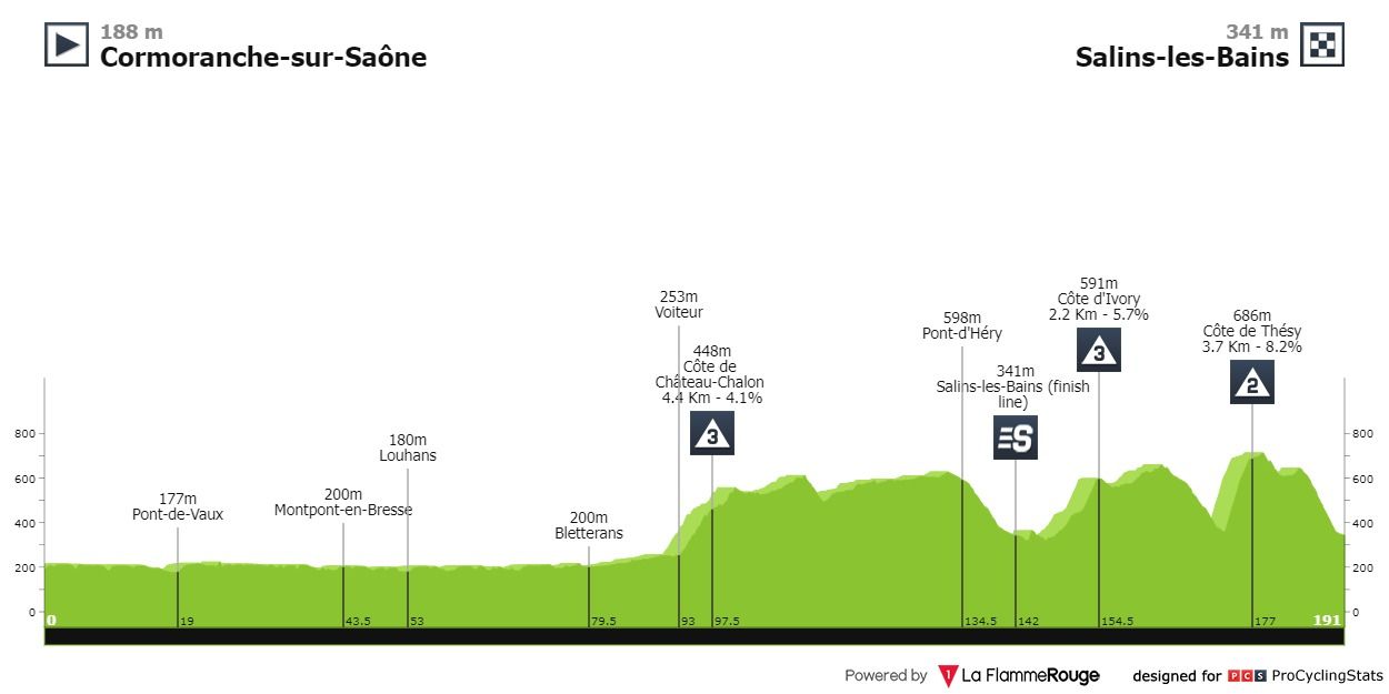 Etapa 5 — Dia de aquecimento para o que aí vem. O Côte de Thésy, já dentro dos últimos 20km, impõe respeito: 3.7km a 8.2%, com a primeira metade da subida acima dos 10%. Dia para os puncheurs.