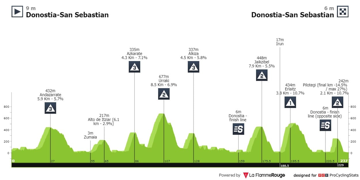 O percurso não é novidade, o pelotão irá andar a subir e descer praticamente o dia todo, com duas passagens pela meta até à chegada final, esta segunda pelo lado oposto. Pelo meio estarão as múltiplas segundas e terceiras categorias como o famosa ascensão a Jaizkibel (7.9km @ 5.5%), havendo no entanto esforços mais duros pela frente.
