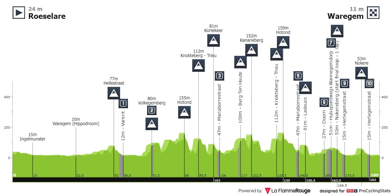A corrida começa 70 quilómetros depois da partida, onde começam a aparecer as primeiras sequências de bergs. As passagens pelo Berg Ten Houte (1km @ 5.7%, em pavé) e pelo Kanarieberg (1.2km @ 8.3%), pela sua próximidade, irão certamente partir o pelotão e fazer a seleção entre quem está ou não apto a disputar esta semi-clássica. Os últimos 45 quilómetros têm 5 secções de pavé, pelo que contamos com muita ação na última hora de corrida. A reta da meta, em Waregem, é curtinha. Se isto for a sprint, atenção ao posicionamento.
