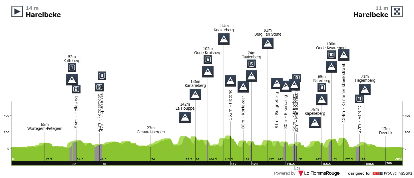 De Harelbeke para Harelbeke. Não há muitas clássicas a começar e acabar na mesma localidade. Um percurso que não costuma sofrer muitas alterações e, este ano, pouco mudou em relação ao ano passado, teremos menos uma subida categorizada, mas mais um setor de pavé, o que em nada deverá mudar o espetáculo que teremos, pois o bloco principal de dureza da prova mantém-se o mesmo.