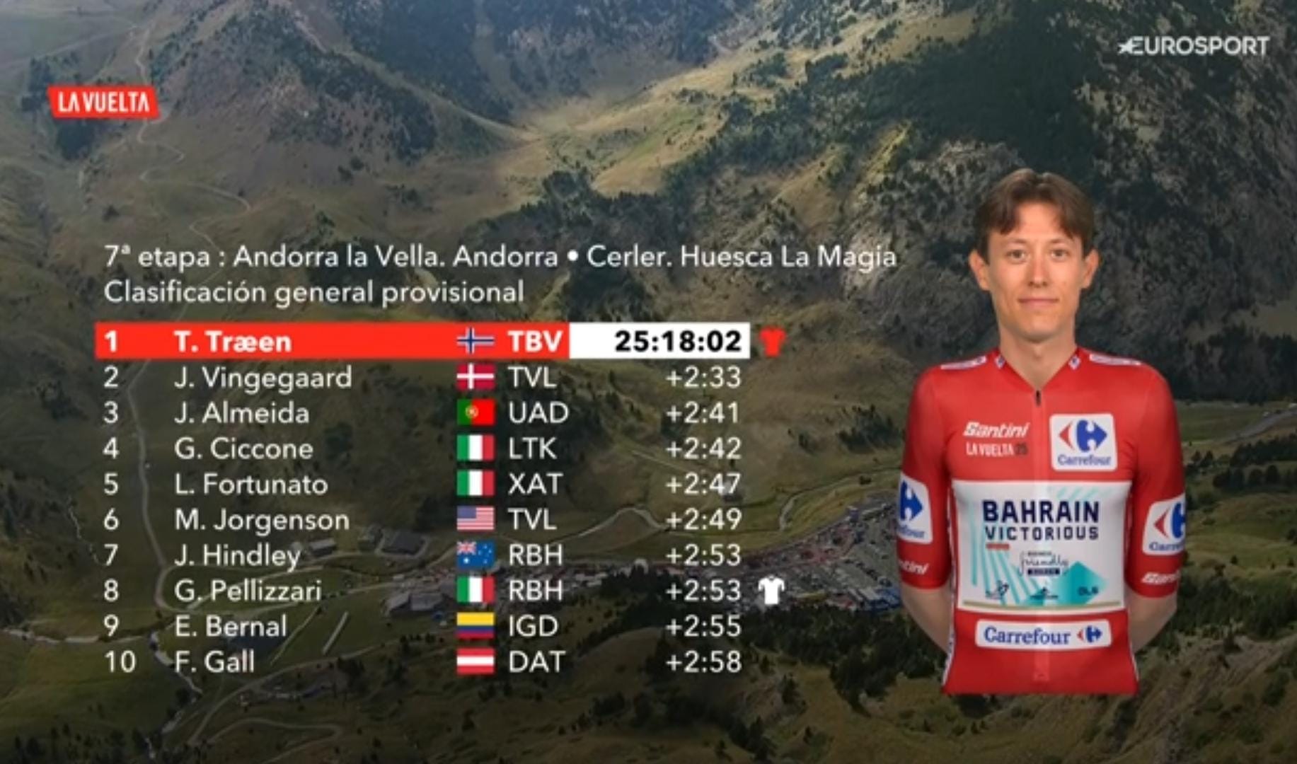 Antonio Tiberi — Ele está cá, nesta Vuelta, não sei se sabiam. Tal como Buitrago, depende da postura da Bahrain para com a camisola vermelha. Mas eu acredito que vão para a etapa.