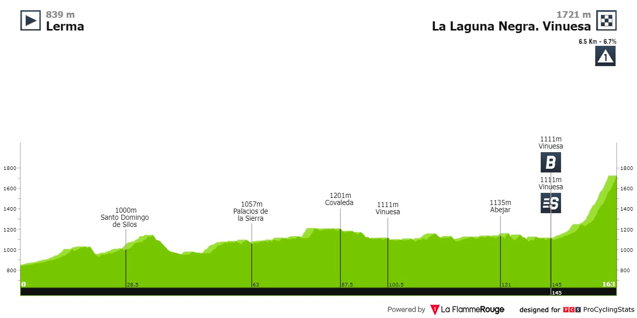 Típica etapa da Vuelta, plana até à subida final, para além disso é uma etapa curta de apenas 163 quilómetros.
