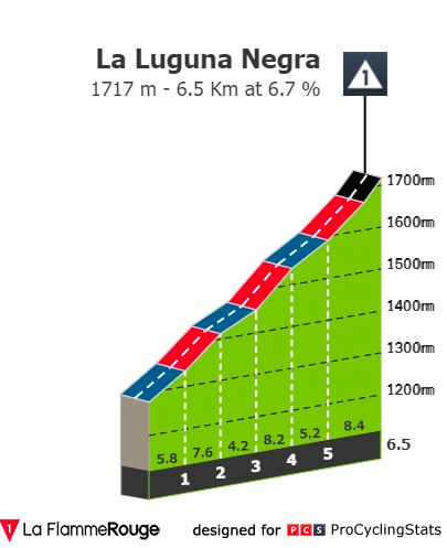 A subida final é a Laguna Negra, subida não muito dura com 6.5 quilómetros a 6.7%. Não deve dar para fazer grandes diferenças.