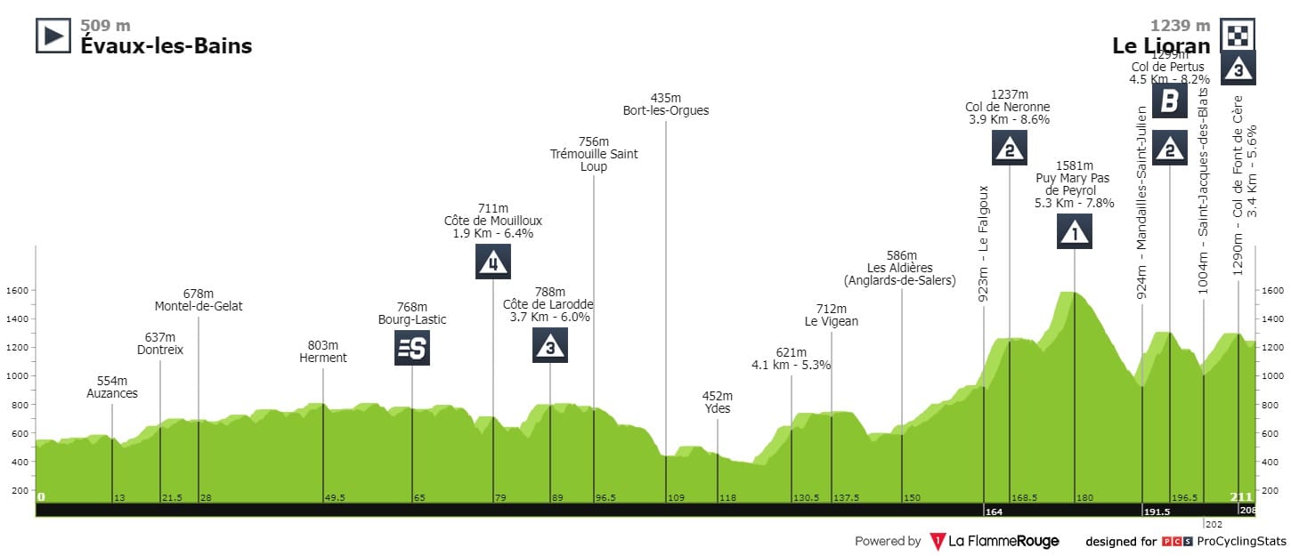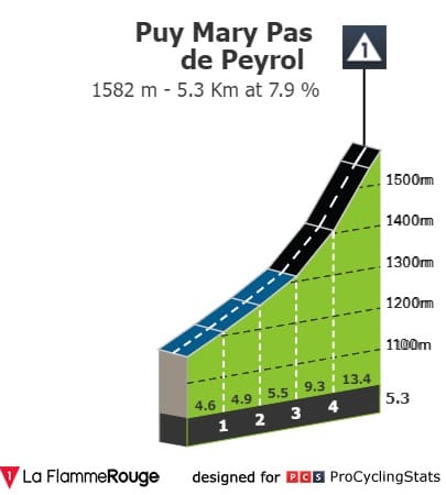 Os últimos 40 quilómetros contam com a passagem no Col de Neronne (3.9km - 8.6%) seguindo imediatamente para o alto do Puy Mary Pas de Peyrol (5.3km - 7.8%) cuja média engana porque o final da subida tem dois quilómetros a mais de 9% .