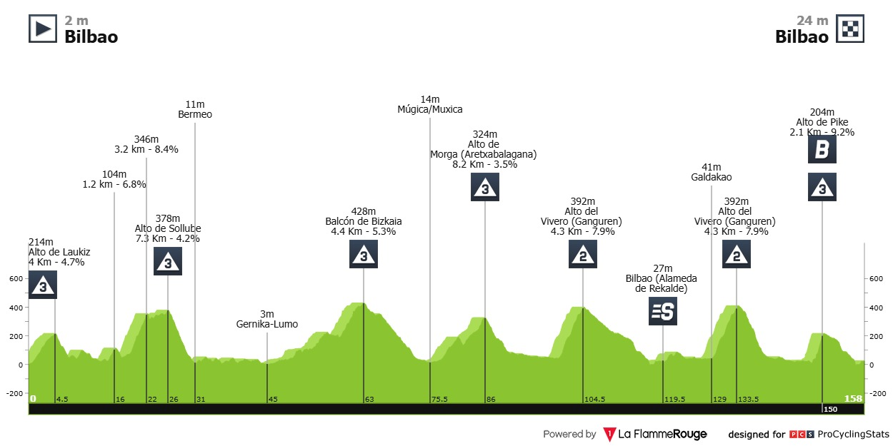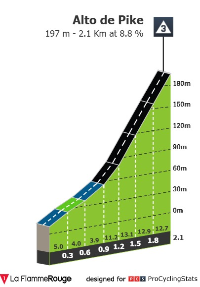 E depois, para fechar, um paredón. Alto de Pike é o Mur de Huy basco e deve chegar para produzir bastante animação. Depois do cume é sempre a descer até à meta, pelo que as diferenças poderão ser difíceis de fechar.