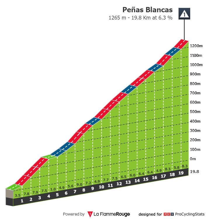 São quase 193 quilómetros pela Andaluzia, entre Salobreña e o Alto de Peñas Blancas, na localidade de Estepona. Tirando uma subida não categorizada que termina a 23 quilómetros do início da última subida, tudo se resume à primeira categoria que teremos no final. E que dureza. São 19,8 quilómetros a 6.3% com a meta colocada a mais de 1200 metros de altitude. É uma ascensão muito longa, com pendentes constantes, quase sempre a rondar os 7% e com um último quilómetro com 8.3% de inclinação média. Esta montanha, ao contrário de tantas outras nesta Volta a Espanha, não é uma estreia na competição. Foi feita na Vuelta de 2013, ano da vitória de Chris Horner, com o checo Leopold König a destacar-se num grupo onde também vinham Daniel Moreno, Nicolas Roche, Thibaut Pinot e Ivan Basso — nesse dia, Alejandro Valverde foi oitavo, Urán foi décimo, Pozzovivo décimo terceiro e Nibali décimo sexto. Também na Volta a Andaluzia de 2016, Peñas Blancas coincidiu com um final de etapa, aí vencida por Valverde — Kelderman foi sétimo e Carthy vigésimo segundo.