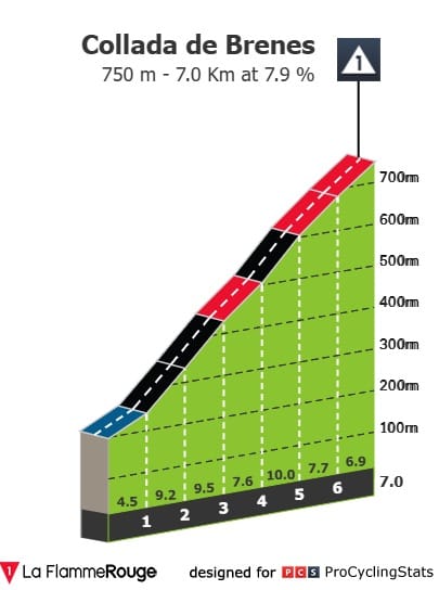 A primeira subida pode bem ser o cenário de se definir os fugitivos, que imagino que sejam muitos. Só não será assim, se a Q36.5 de Tom Pidcock quiser controlar a fuga para a vitória em etapa do britânico — sobretudo depois de o que aconteceu em Bilbao; Pidders ia muito provavelmente para a vitória. A fuga tem aqui mais uma bela hipótese. No entanto, naturalmente, a Collada de Brenes vai, provavelmente, agitar algumas águas no grupo dos principais favoritos. Tem um quilómetro a 10% de média (e outros dois acima de 9%), é demasiado bom para que ninguém tente.