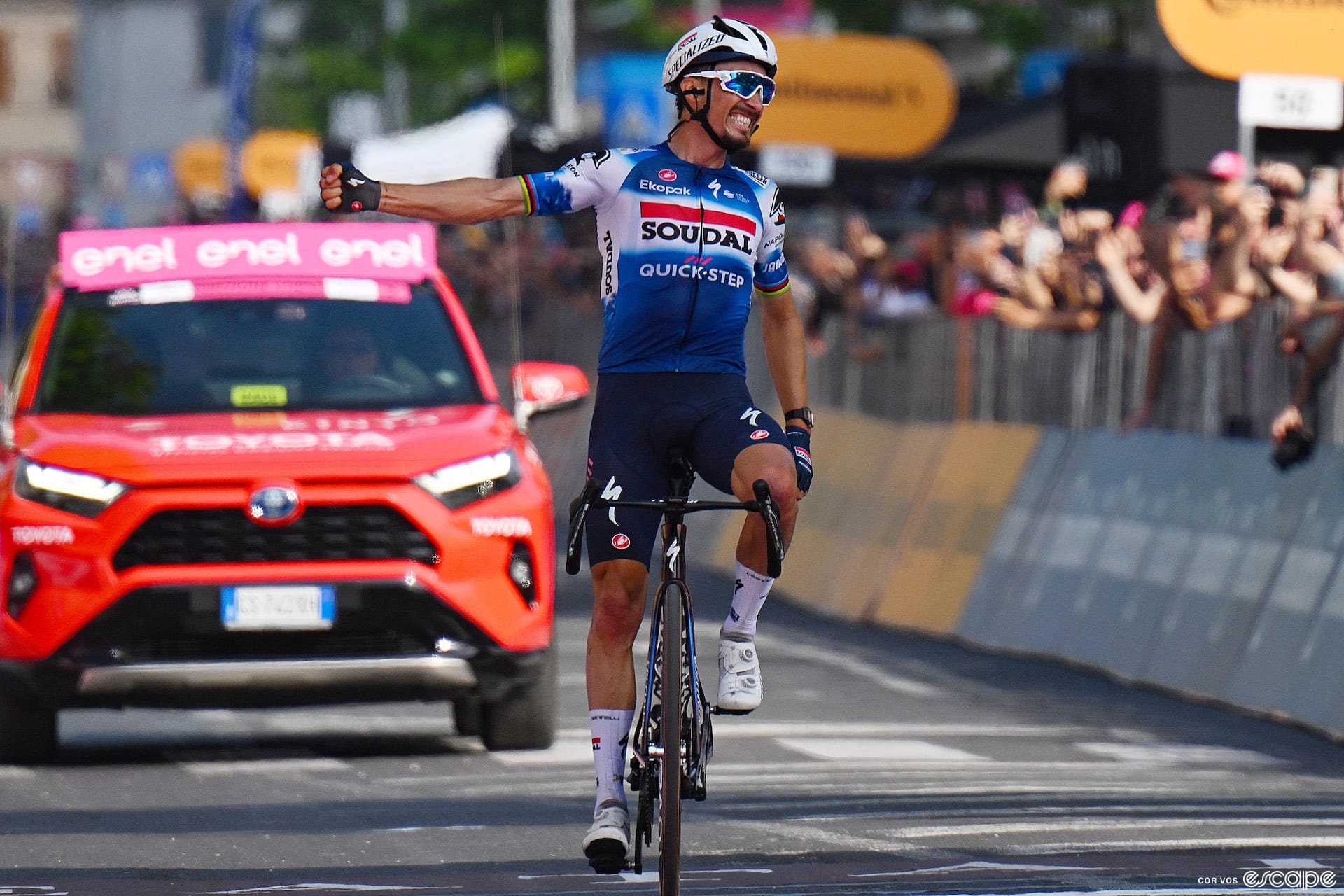 Venceu a fuga da fuga. A etapa demorou mais de 55 quilómetros até ver formada a primeira escapada, mas não foi uma fuga qualquer. Alaphilippe na primeira subida não categorizada do dia levou consigo 35 corredores e formaram a primeira fuga do dia, com nomes como Jonathan Narváez, Pelayo Sánchez ou Mirco Maestri a integrar o grupo. Entre tentativas de saída por parte de alguns corredores e o reagrupar dos diferentes grupos, foram Julian Alaphilippe e Mirco Maestri que acabaram por bonificar e a 116 quilómetros da meta já levavam mais de um minuto para o grupo perseguidor. O francês e o veterano italiano entenderam-se bem e foi o espírito de cooperação que fez com que não fossem apanhados, até cerca de 10 quilóimetros para o final quando Julian Alaphilippe deixou Maestri para trás e foi sozinho para sua primeira vitória da carreira no Giro d'Itália.