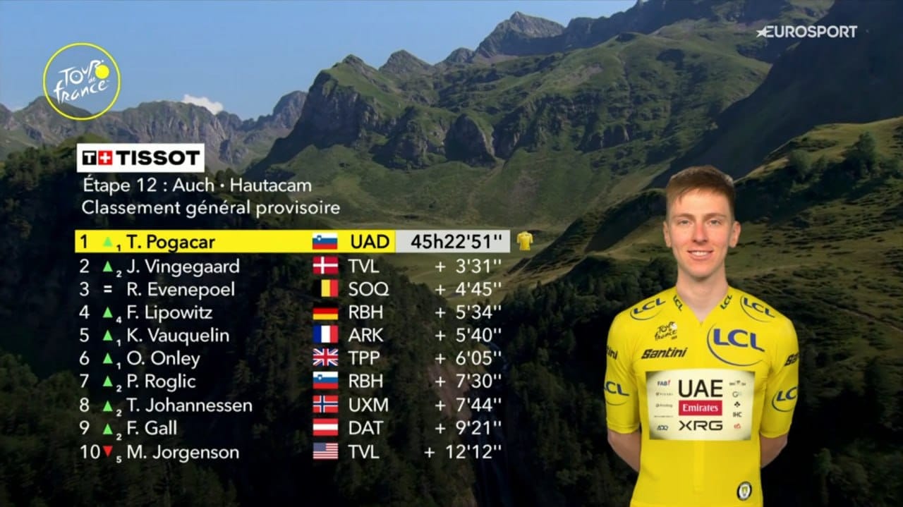 Na descida Tim Wellens desligou-se da fuga e desceu até ao grupo de Pogačar para dar as boas vindas a Evenepoel que entretanto tinha completado uma almeidada intermédia e regressado ao grupo dos favoritos. O ritmo do belga da Emirates era alto e iniciaram a subida do Hautacam a sensivelmente 1:30 de Armirail. Pouco depois Remco ficava novamente para trás. A 12 quilómetros da meta Nárvaez faz com sucesso aquilo que estava destinado ao nosso João Almeida: um lançamento brutal que dropa toda a gente e BOOOOM, lá vai o Pogi. O esloveno entrou em modo cronoescalada e foi cavando o fosso para Vingegaard. No final foram 2:10 de diferença para o dinamarquês, que está agora mais perto do sexto (Oscar Onley!) do que da camisola amarela. C'est fini.