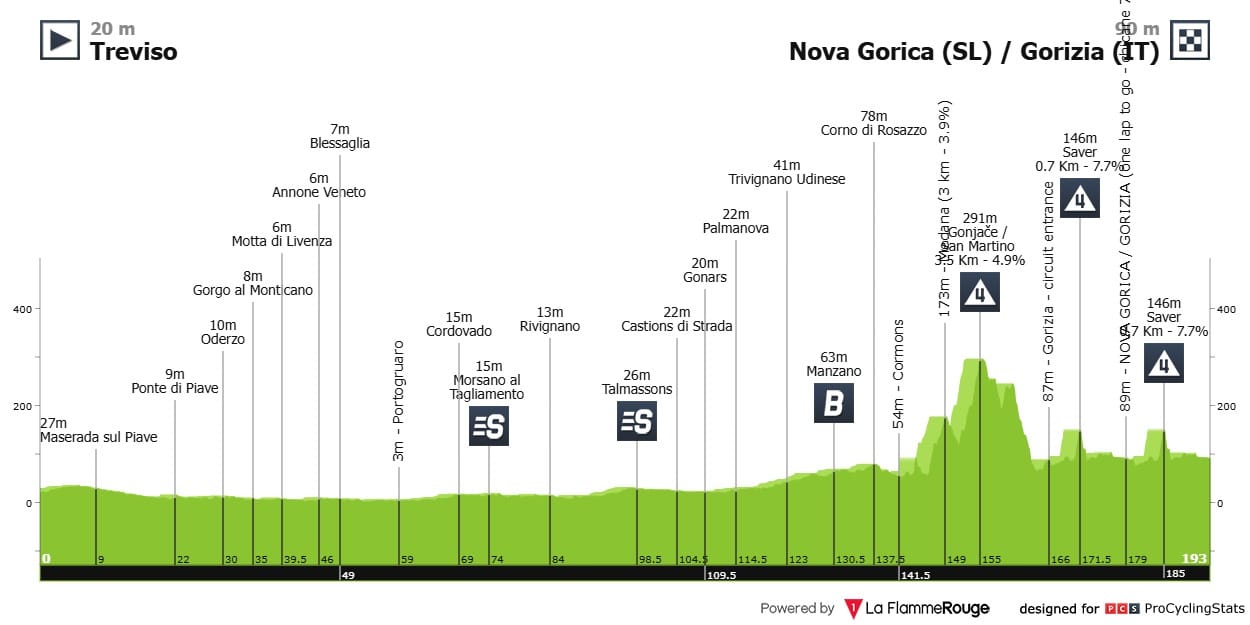 Etapa plana com três lombas irrelevantes na parte final e várias passagens pela fronteira entre a Itália e a Eslovénia.