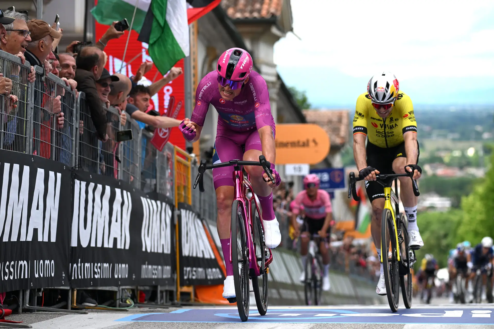 Depois chegava a vez da UAE Emirates preparar o sprint bonificado de Arcugnano, a dez quilómetros da meta, e bonificaram quatro e dois segundos com Ayuso e Del Toro, respetivamente. Deu a sensação que o mexicano deixou o espanhol passar na frente.