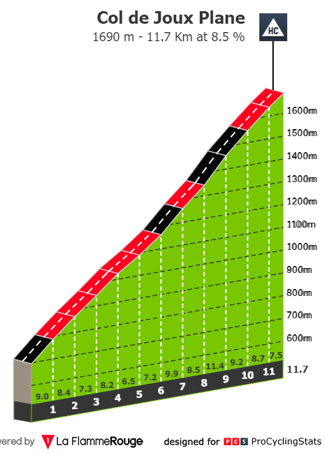 As duas últimas subidas são as típicas do Tour. Muito longas, com pendentes médias ligeiramente abaixo dos 10%, onde se destaca o Col de Joux Plane com 11 quilómetros a 8.5%.